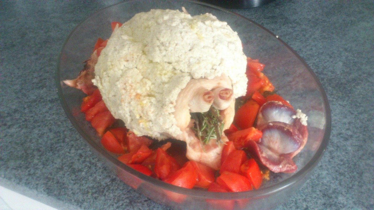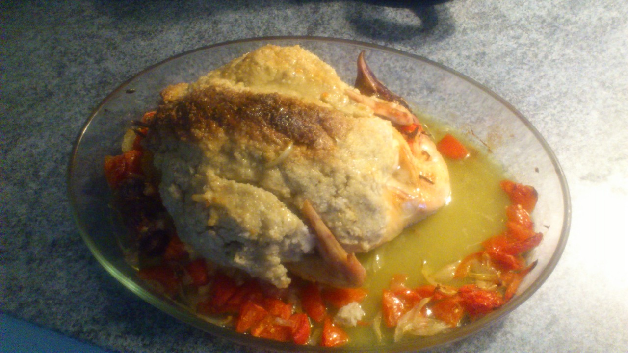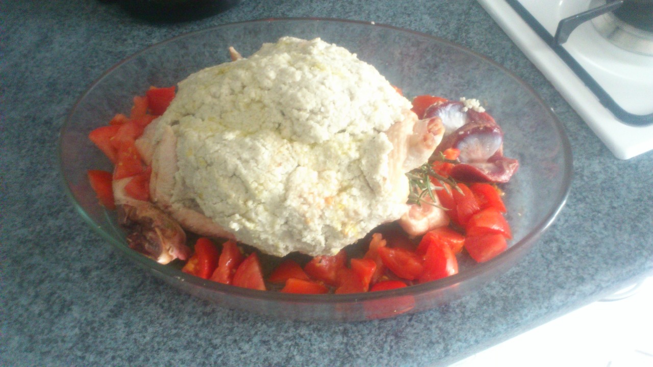 Recouvrez le poulet d'une couche de pate au sel. Enfournez.